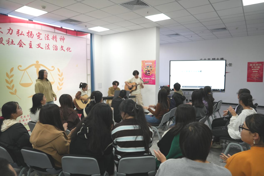 活动伊始,开展“宪法歌曲广传唱”,四位同学以乐器演奏的形式带领同学们共同演唱《宪法伴我们成长》,在欣赏音乐的同时,同学们也更加理解了宪法与我们的生活息息相关,每一个的重要时刻,宪法都在为我们保驾护航。