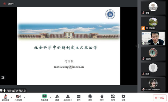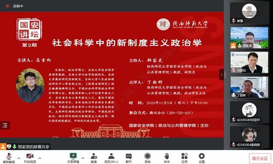 2022年11月5日,公司国安讲坛第2期学术报告在腾讯会议平台举行。吉林大学行政公司教授、副经理马雪松受邀担任主讲嘉宾,作题为“社会科学中的新制度主义政治学”的学术报告。本次讲座由公司副经理郑家昊教授主持,政治学系主任丁韶彬教授点评,公司及其他公司师生120余人参会。