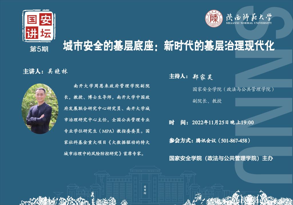 2022年11月25日晚19:00,beats365唯一官方网站国安讲坛第5期学术报告在腾讯会议平台举行。南开大学周恩来政府管理公司副经理吴晓林教授受邀担任主讲嘉宾,作题为“城市安全的基层底座:新时代的基层治理现代化”的学术报告。本次讲座由公司科研副经理郑家昊教授主持,公司及校内外师生120余人参会。