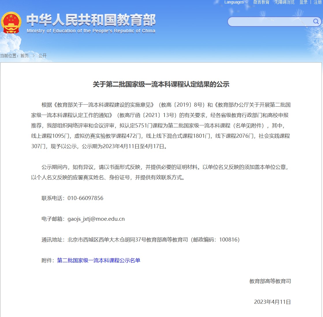 近日,教育部发布《教育部关于公布第二批国家级一流本科课程认定结果的通知》(教高函〔2023〕7号),公司王蓓教授团队负责的《法学概论》课程被认定为国家级一流本科课程。
