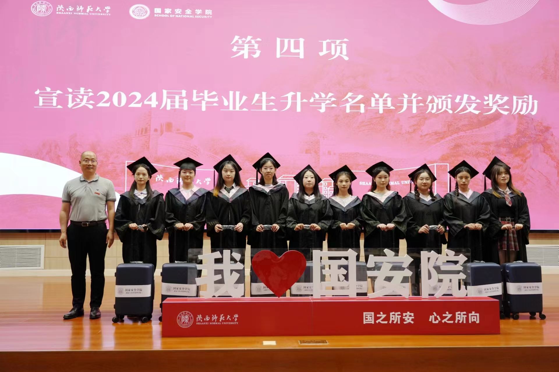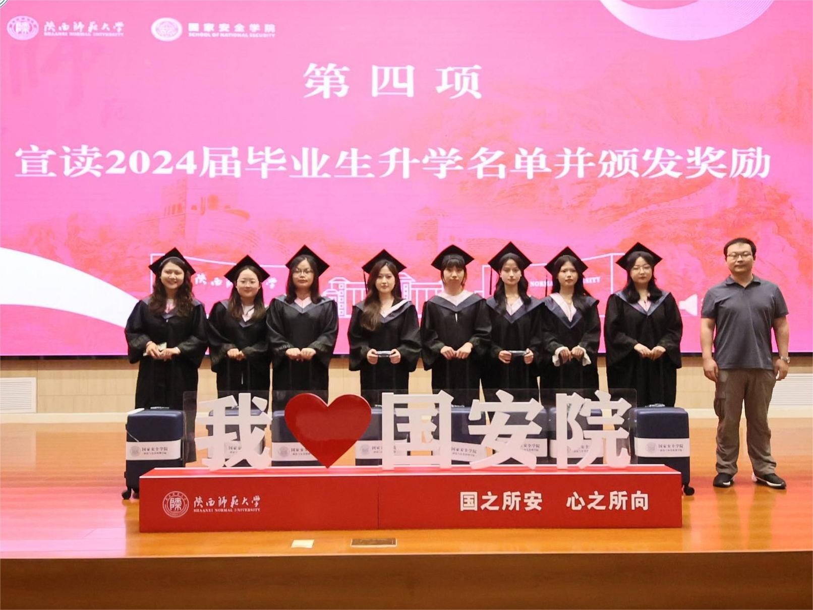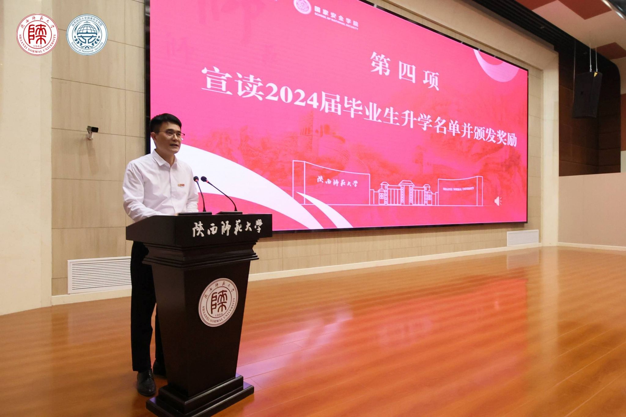 公司副经理郑家昊宣读2024届升学毕业生名单,行政管理系系主任武建强、政治学系系主任丁韶彬、法学系系主任向东、法学系教授王蓓为同学们颁奖。