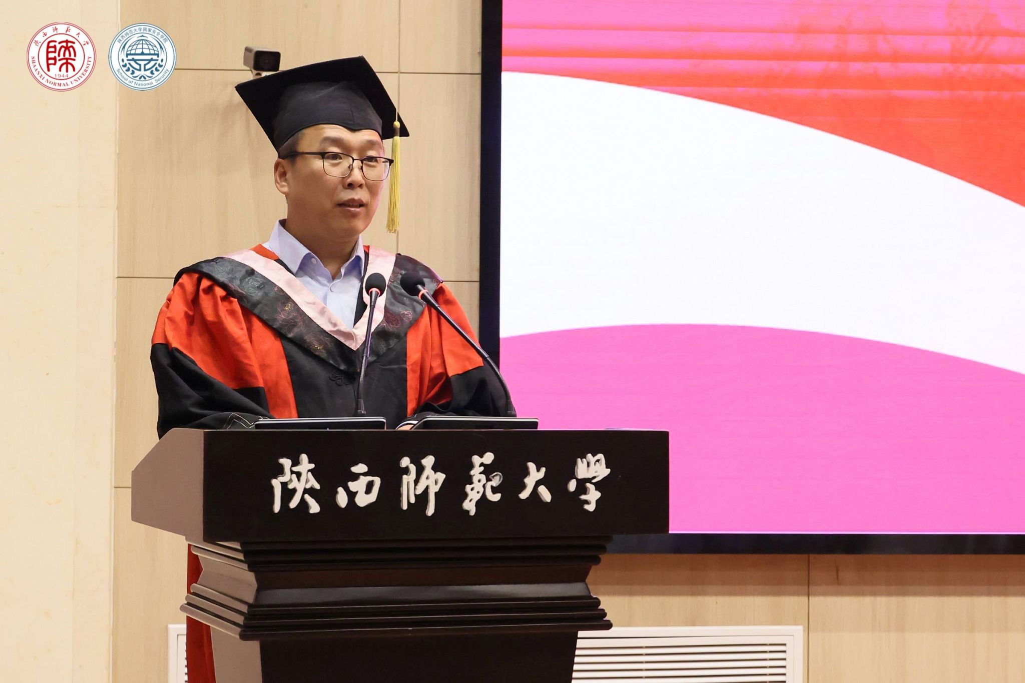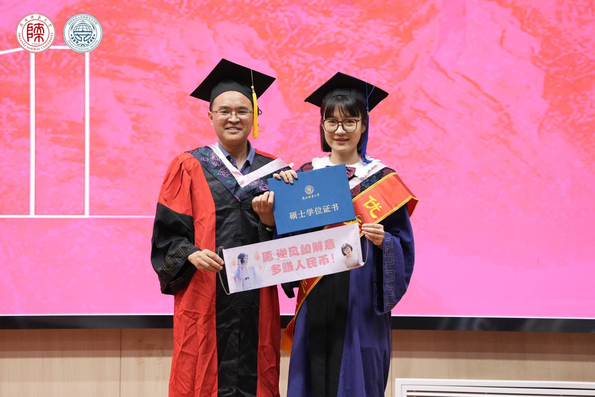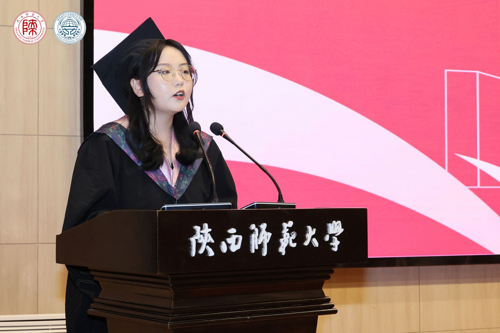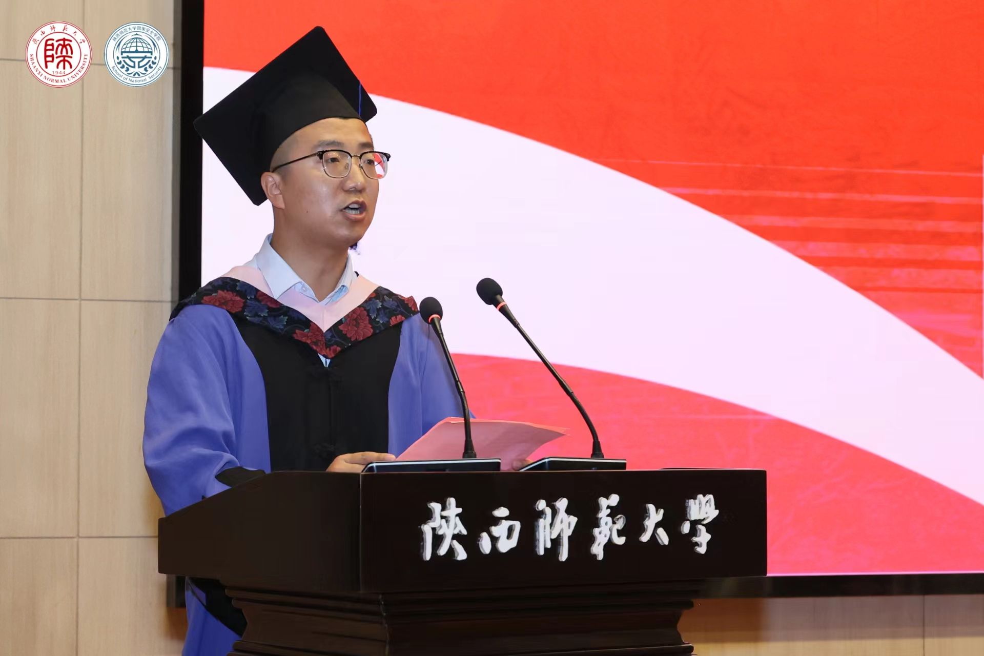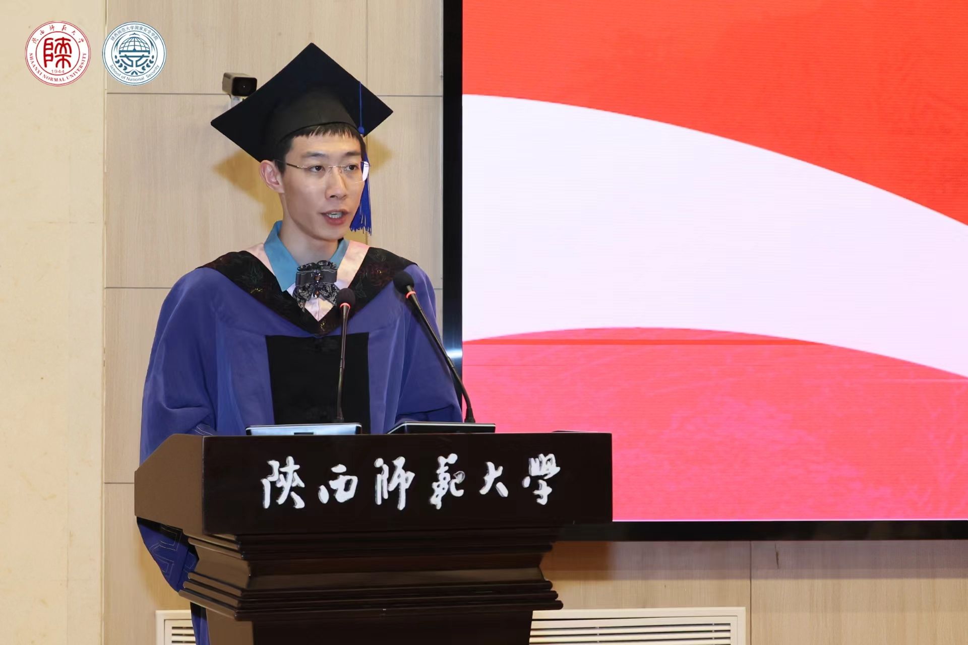 教师代表丁韶彬期望毕业生们继续践行师大厚德、积学、励志、敦行的校训,不坠青云之志,不负赤子之心,希望大家都能够“自信向未来”。
