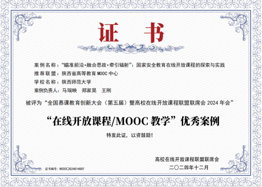 马瑞映教授团队的案例《“瞄准前沿·融合思政·牵引辐射”:国家安全教育在线开放课程的探索与实践》荣获全国“在线开放课程/MOOC教学”优秀案例。