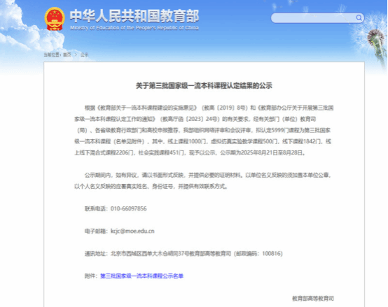 一、公司1门课程获批第三批国家级线上一流本科课程