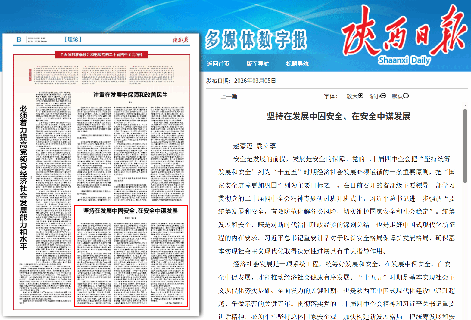 经济社会发展是一项系统工程,统筹好发展和安全,在发展中保安全、在安全中促发展,才能推动经济社会健康有序发展。“十五五”时期是基本实现社会主义现代化夯实基础、全面发力的关键时期,也是陕西在中国式现代化建设中追赶超越、争做示范的关键五年。贯彻落实党的二十届四中全会精神和习近平总书记重要讲话精神,必须牢牢坚持总体国家安全观,加快构建新发展格局,把统筹发展和安全贯穿我国经济社会发展的各方面和全过程,努力建设更高水平平安陕西,以高质量发展促进高水平安全,以高水平安全保障高质量发展,更好地为“十五五”规划顺利实施保驾护航。